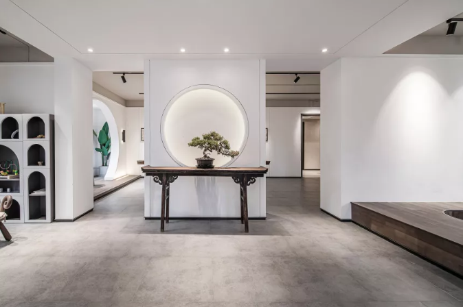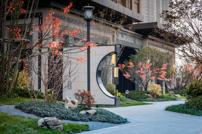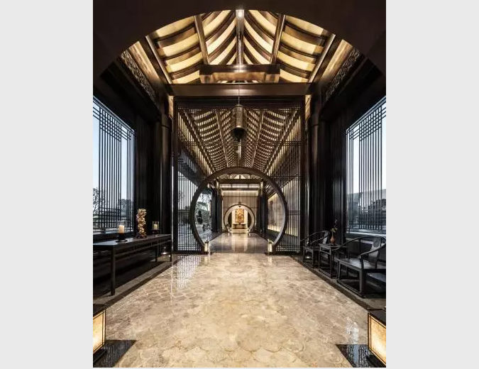 迎賓門以中國傳統(tǒng)的“月門”來規(guī)劃空間,形如滿月、透光而幽靜,在入廊穿月的過程中,產(chǎn)生層層遞進(jìn)的空間體驗。