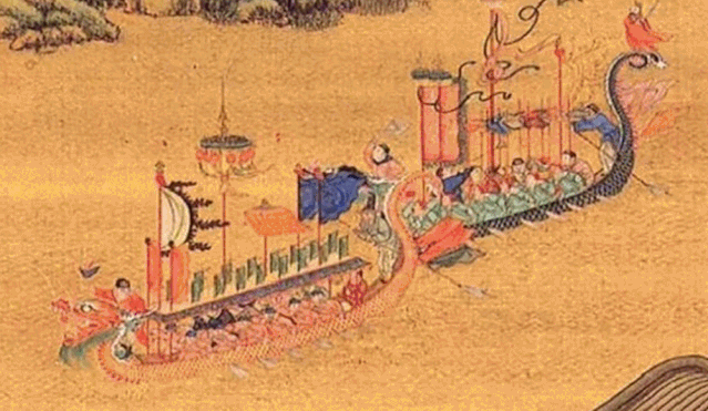 人們在急鼓聲中劃龍形的獨木舟
